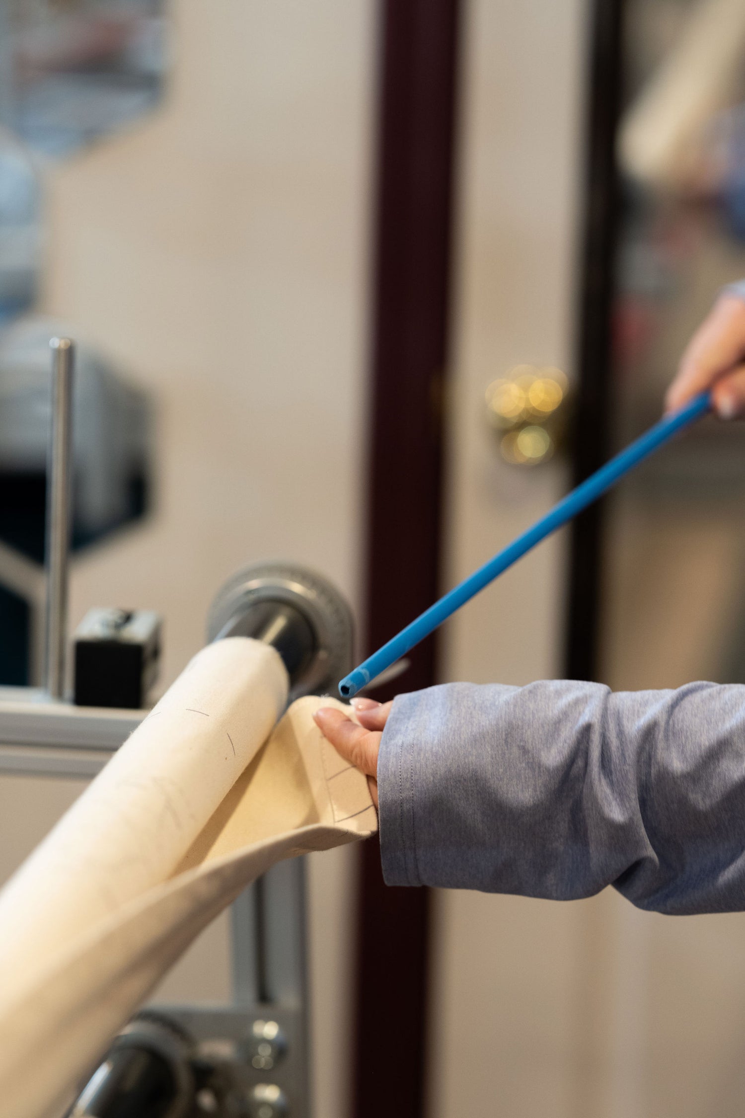This is the first rod and grip method for setting up the backing to the leaders. And if you use all three rollers you can set up the top leader also. The rod is placed in the (3/4" or 2cm) casing of the leaders and is held together by a heat shrink or tape inside the casing. The grip is snapped on over the backing on the rods. It is snapped on like a zip lock bag, you start at one end and work your way across the leaders. The grip is clear so you can see if it is catching all of the edge of the backing. The grip has a top edge so it is easy to press over the dowel rods and easy to pull up when you are finish with the quilting. Leadergrips holds the fabric taunt and smooth.